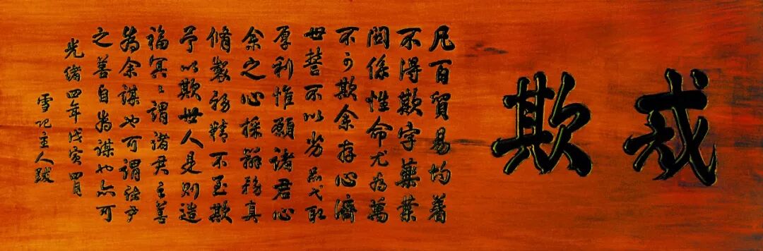 诸多匾牌之中,让人印象最深刻的莫过于“戒欺”匾。它由创始人胡雪岩于开业之初跋文写就。“戒欺”匾曰:“凡百贸易均着不得欺字,药业关系性命尤为万不可欺。余存心济世誓不以劣品弋取厚利,惟愿诸君心余之心。采办务真,修制务精,不至欺予以欺世人,是则造福冥冥,谓诸君之善为余谋也可,谓诸君之善自为谋也亦可。”